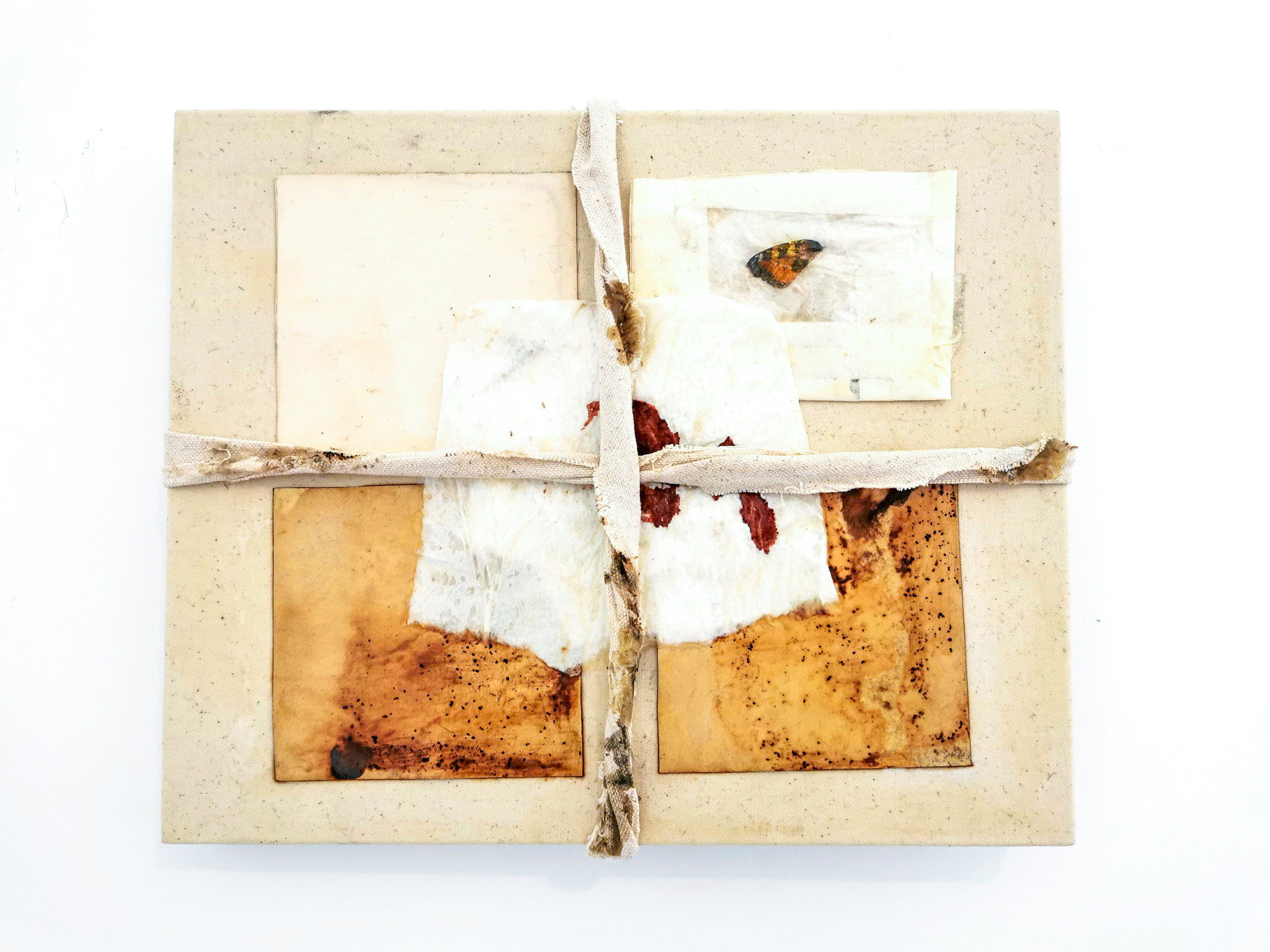 blood, tissue, coffee, paper, butterfly wing, cotton canvas.